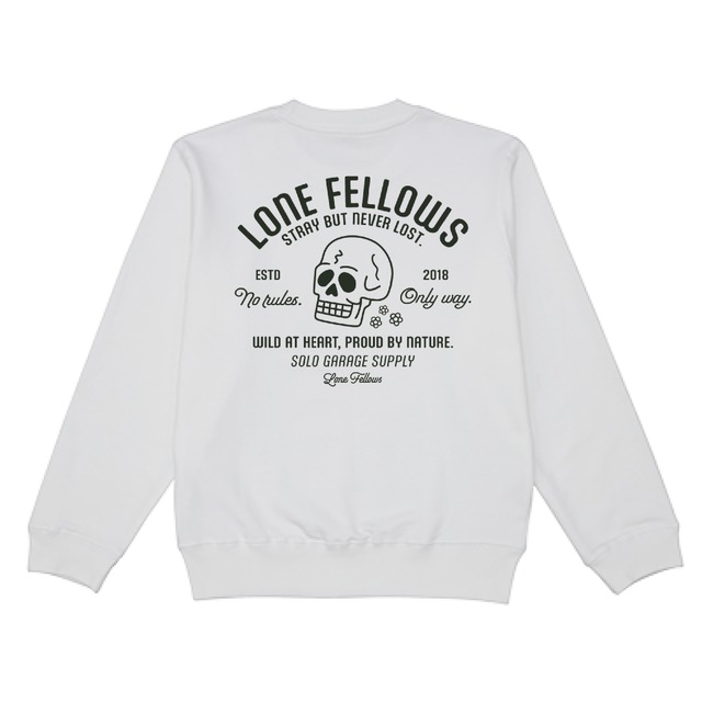 【極寒の道も、己の信念で突き進む】 LONEFELLOWSの核心を突くメッセージ "No rules. Only way." を刻んだ「SOLO WAY SKULL」が、最上位の防寒性を備えたヘビーウェイト・スウェットで登場。 フロントには誇り高きメインロゴ、バックには揺るぎない意志の象徴であるスカルを。誰にも媚びず、自らの直感に従って生きる「FELLOWS」にこそ相応しい、重厚な一着です。 【デザインのこだわり】 Front View: 左胸にはブランドのアイデンティティであるメインロゴ(ペナントロゴ)を配置。肉厚なスウェット生地の上で、LONEFELLOWSの一員であることを静かに、かつ力強く主張します。 Back View: 中央に鎮座するスカルと、それを囲むアーチロゴ。モノトーンを基調とした無骨なデザインが、冬のストリートやガレージで圧倒的な存在感を放ちます。 The Philosophy: 筆記体で綴られた "No rules. Only way." と、下部の "WILD AT HEART, PROUD BY NATURE."。この一着を纏うことは、ブランドが掲げる「型にはまらない自由」と「生まれ持った誇り」を体現することを意味します。 Timeless Style: 1950年代のワークウェアを彷彿とさせるタイポグラフィが、現代のシルエットと融合。流行に左右されず、長く愛用できるマスターピースに仕上げました。 【素材とシルエット】 Fabric: 冬の厳しい寒さやハードなガレージワークを想定し、高密度でタフなヘビーウェイト素材を採用。肌触りの良い裏起毛(または裏毛)仕様が、抜群の保温性と安心感を提供します。 Silhouette: アウターとのレイヤードでも、一枚での着用でもサマになるスタンダードフィット。袖口と裾の強力なリブが、全体のシルエットを美しく保ちながら、冷気の侵入をシャットアウトします。