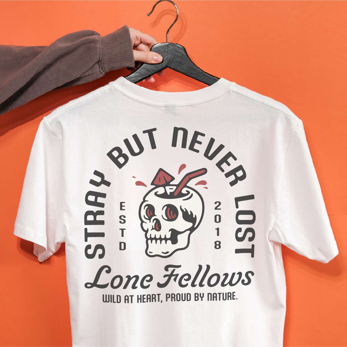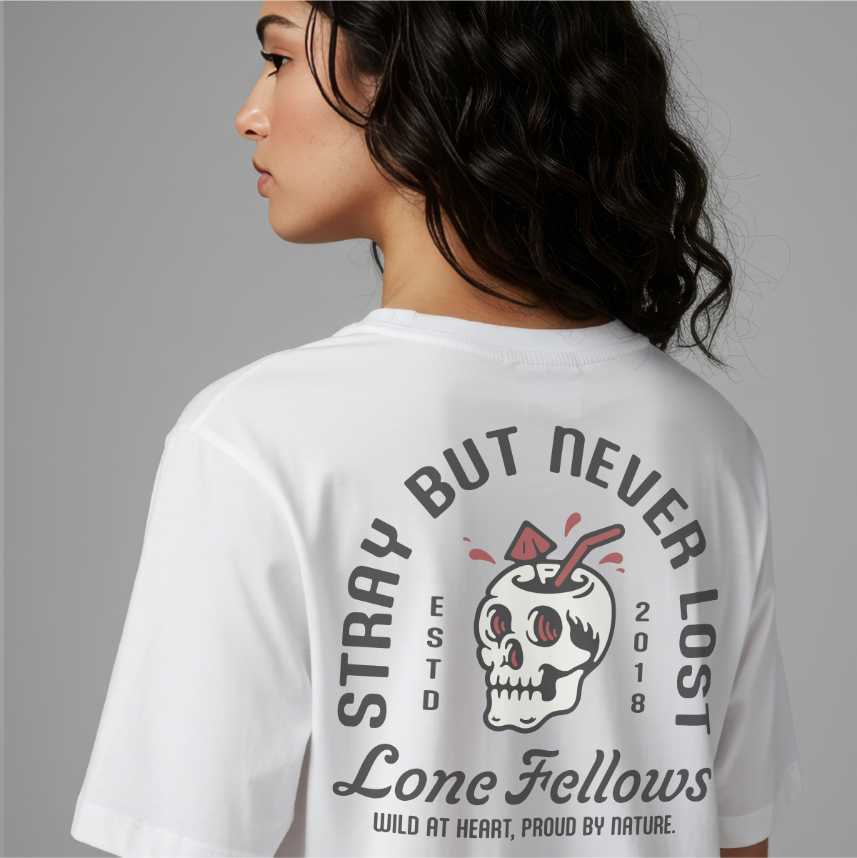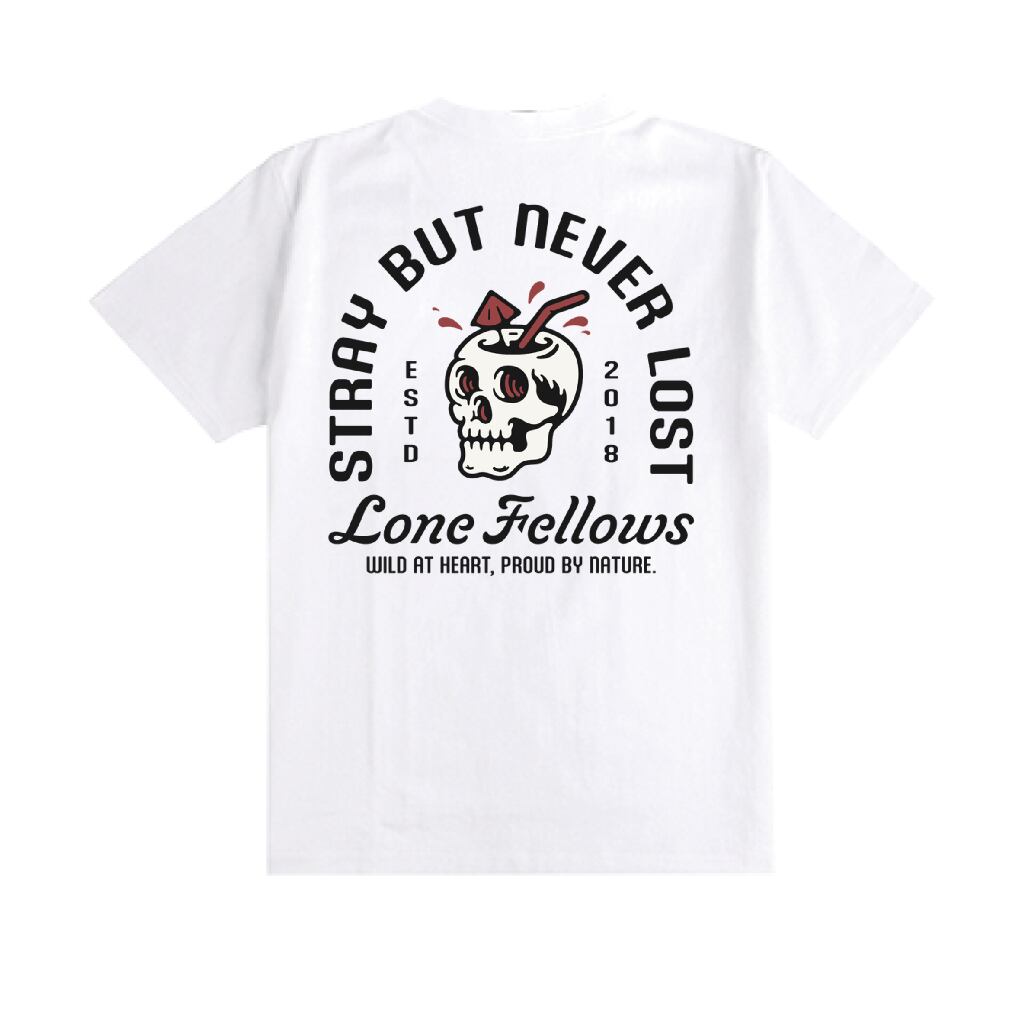 ブランドのコアメッセージ "STRAY BUT NEVER LOST" を、パンキッシュなグラフィックで表現した一着。頭蓋を器にしたカクテルのイラストは、人生の苦味さえもスパイスとして愉しむ、タフで自由な精神を象徴しています。
