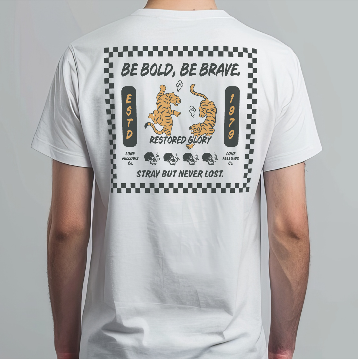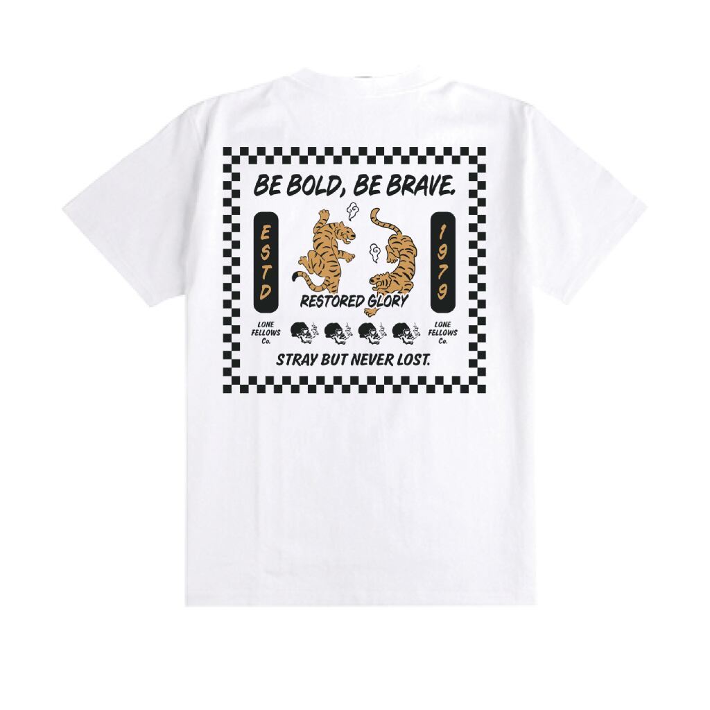 ブランドの信念 "STRAY BUT NEVER LOST" を、力強い虎のグラフィックで表現した一着。 メインコピーの "BE BOLD, BE BRAVE."(大胆であれ、勇敢であれ)は、困難に立ち向かい、自らの道を切り拓こうとするすべての人への鼓舞を込めています。
