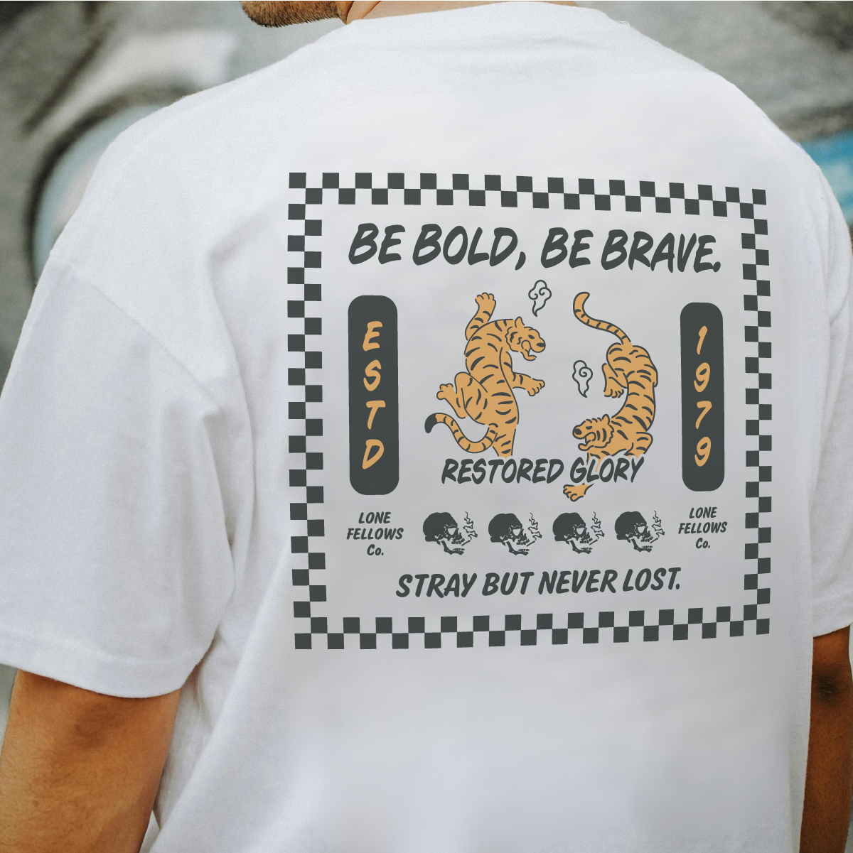 Checker Frame: グラフィック全体を縁取るチェッカーフラッグが、クラシックなレースシーンのような緊張感と、LONEFELLOWSらしい遊び心を演出します。