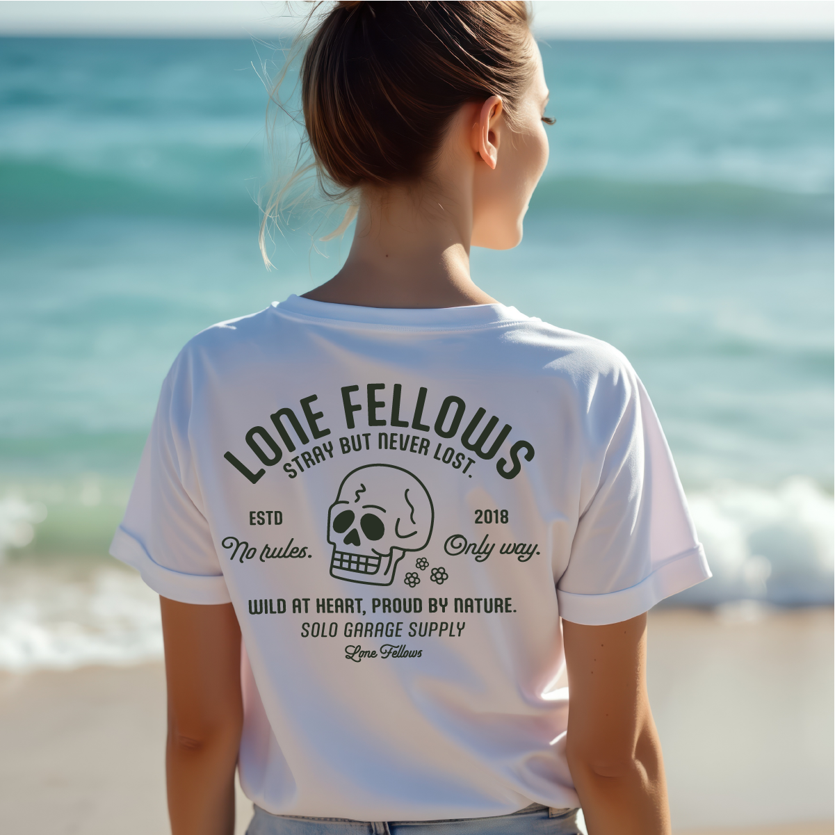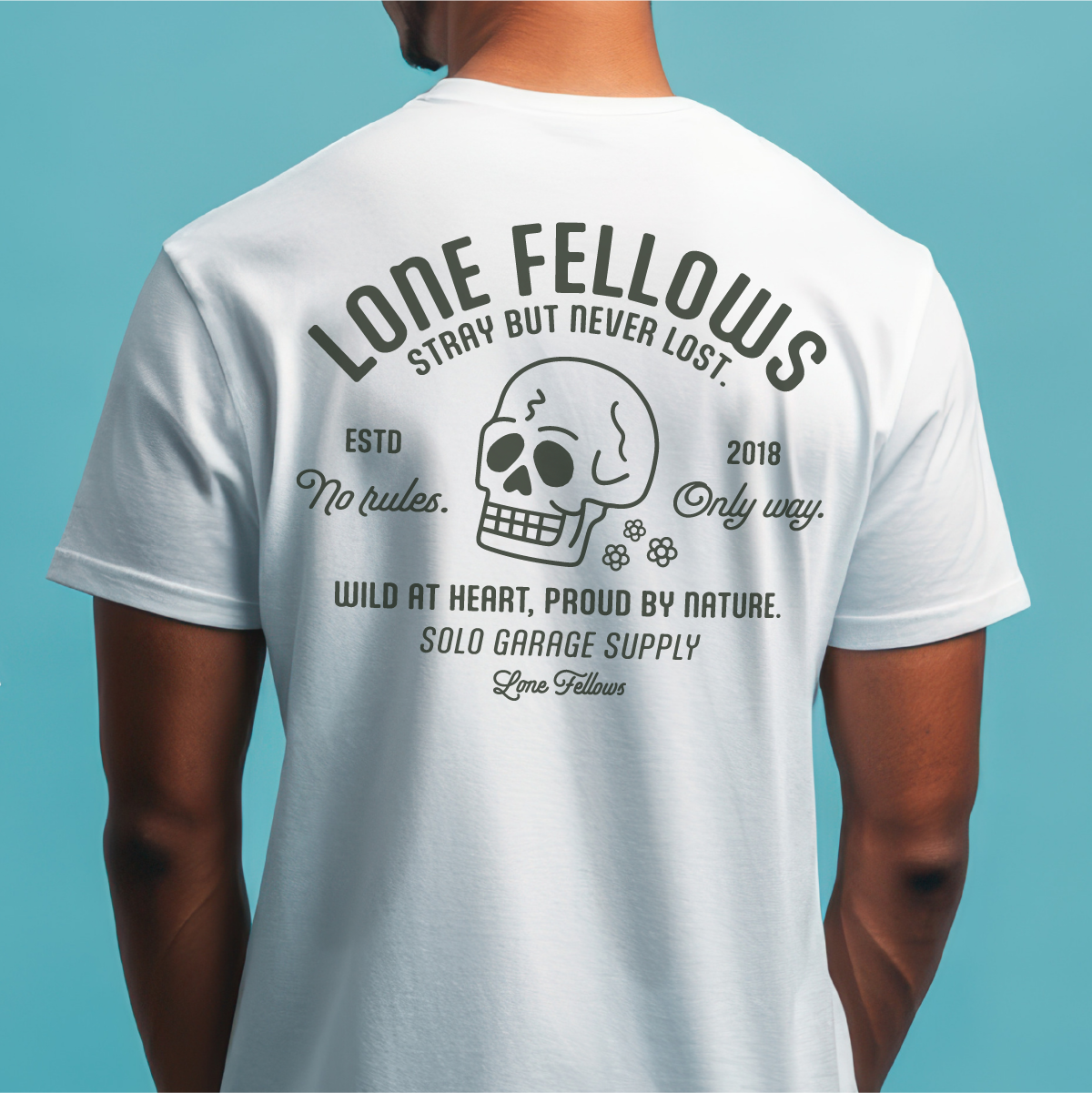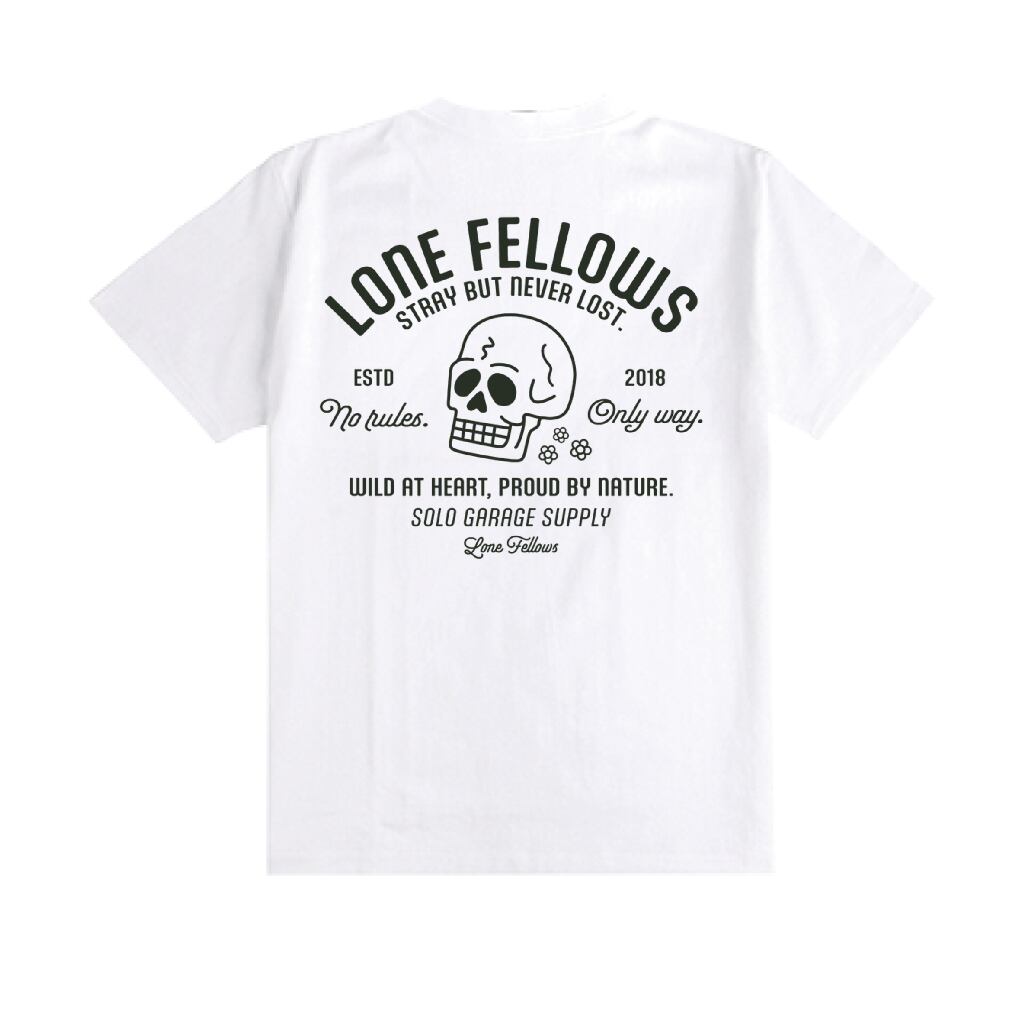 ブランドの核心を突く "No rules. Only way."(ルールはない。あるのは己の道だけ)という言葉を掲げた、意志の強い一着。中央に鎮座するスカルは、周囲の雑音に惑わされず、自らの信念を貫き通す「LONEFELLOWS」の揺るぎない精神を象徴しています。
