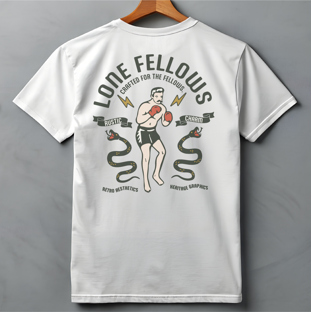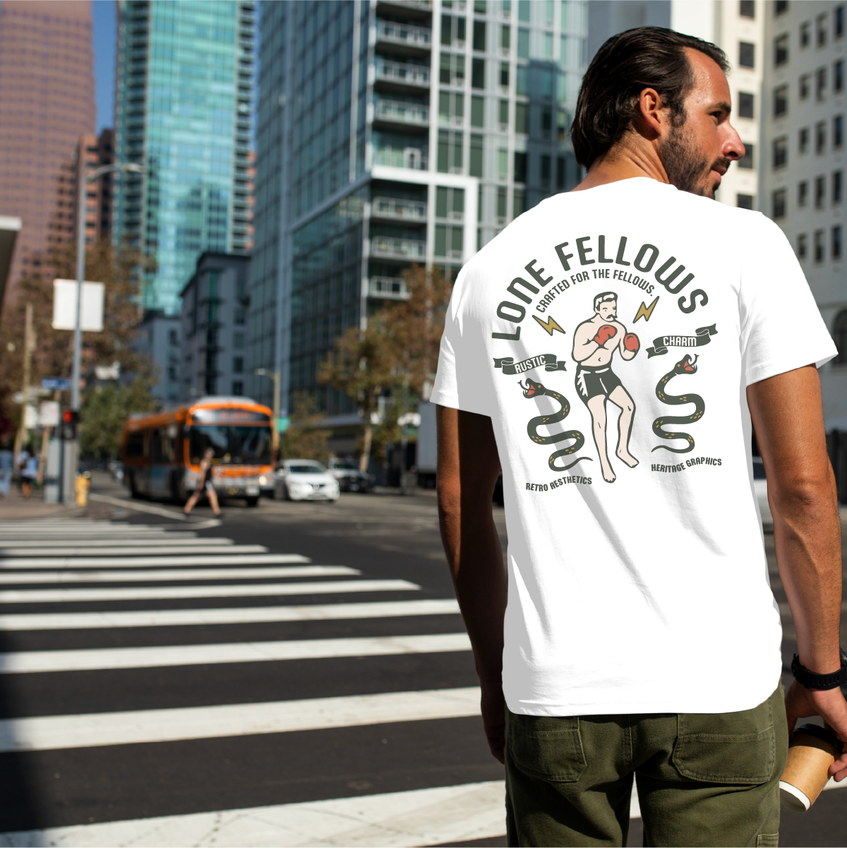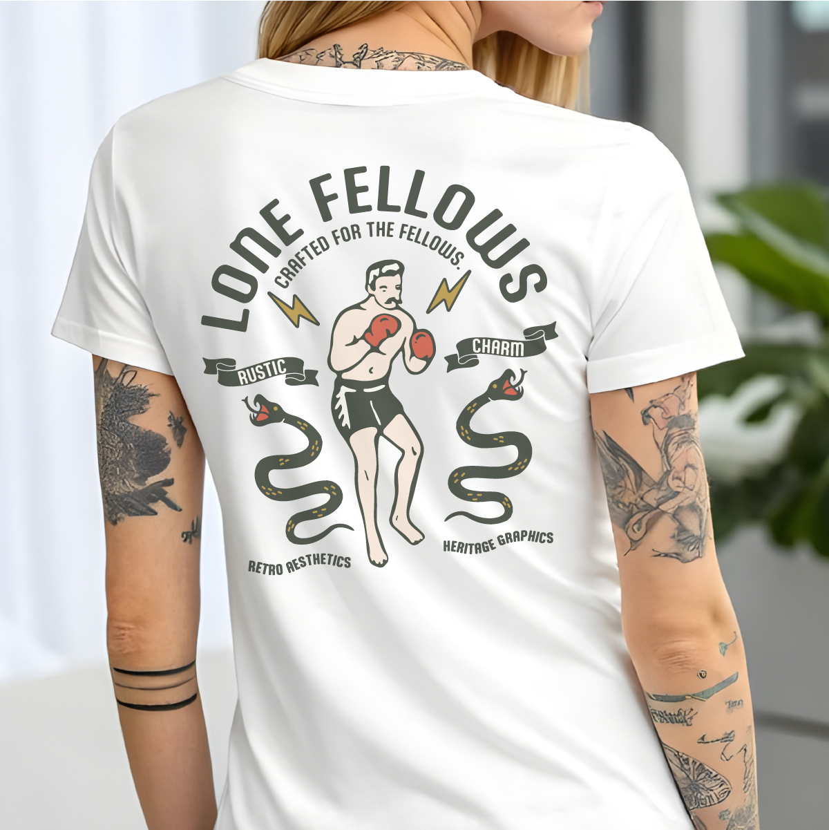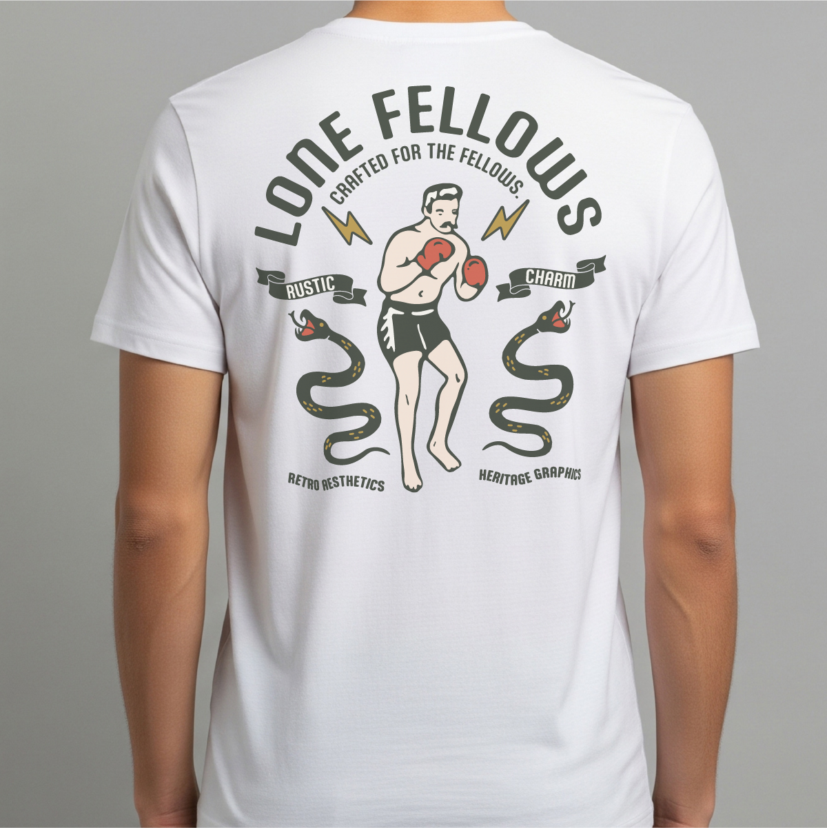 The Boxer & Snakes: 2匹の蛇に立ち向かうボクサーの姿は、困難な状況下でも冷静に、かつ果敢に挑戦し続ける「LONEFELLOWS」の精神を表現しています。