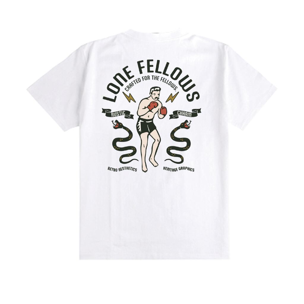 ヴィンテージのボクシングポスターやタトゥーアートを彷彿とさせる、情熱的な一着。中央に描かれたボクサーと、その周囲を取り巻く蛇は、外敵だけでなく「己の内なる弱さ」と闘い続ける人の象徴です。
