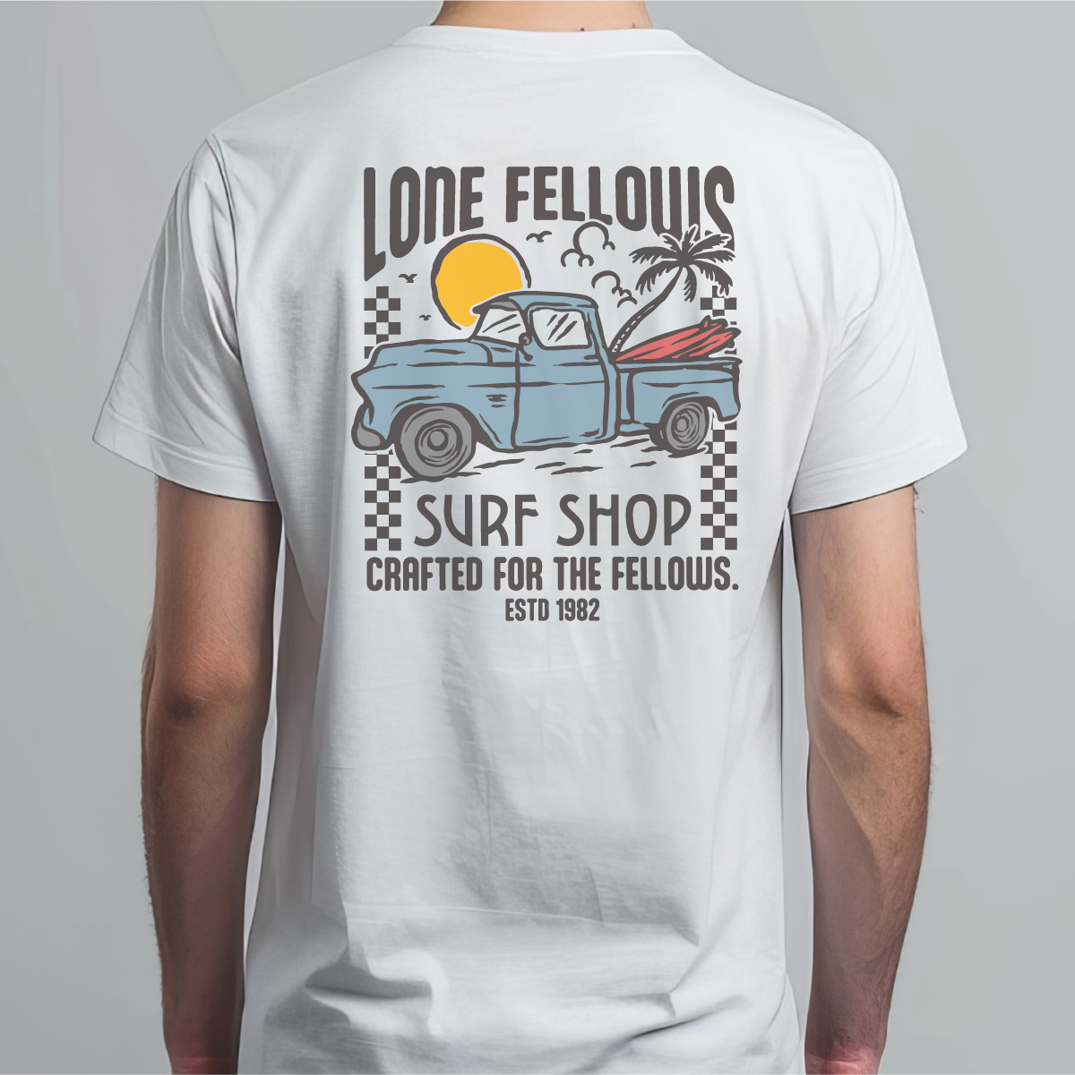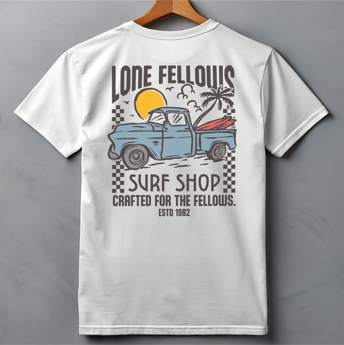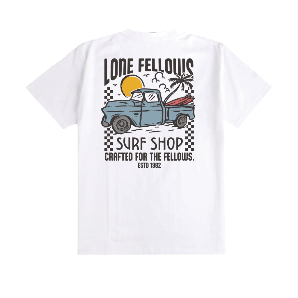 Checker Pattern: デザインを支えるチェッカーフラッグが、単なるサーフTシャツに終わらせない「LONEFELLOWS」らしいモータースポーツのスパイスを加えています。
