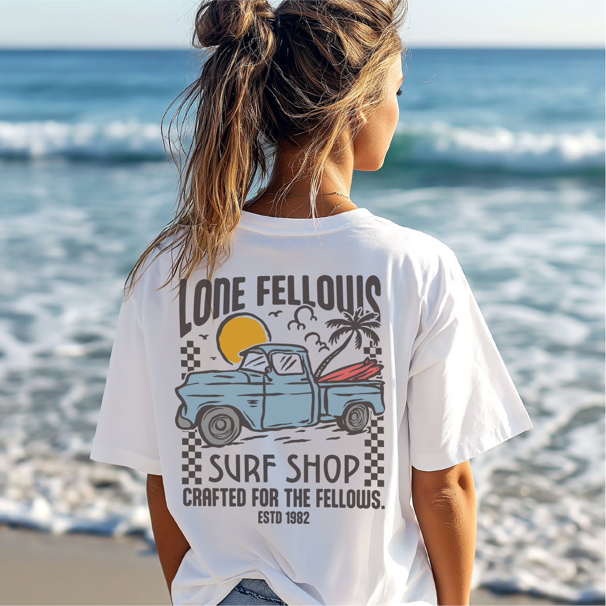 LONEFELLOWSが提案する、リラックスした休日のためのアイデンティティ。 背面に描かれたヴィンテージ・トラックとサーフボードのグラフィックは、都会の喧騒を離れ、ただ良い波と静かな時間を求めて旅をする「大人の自由」を象徴しています。