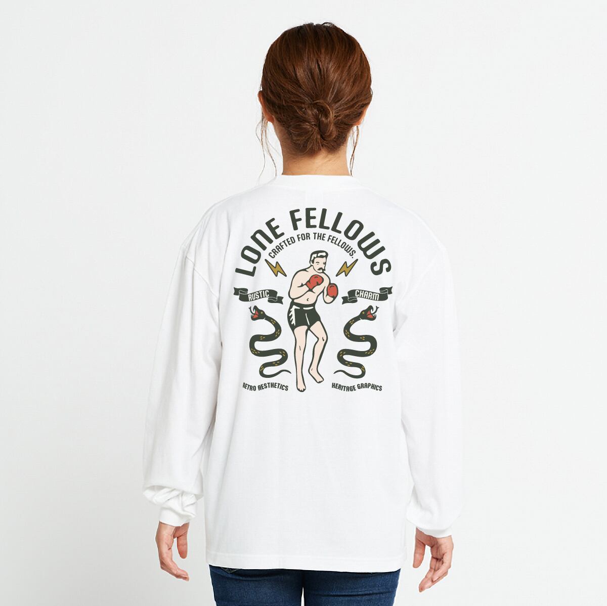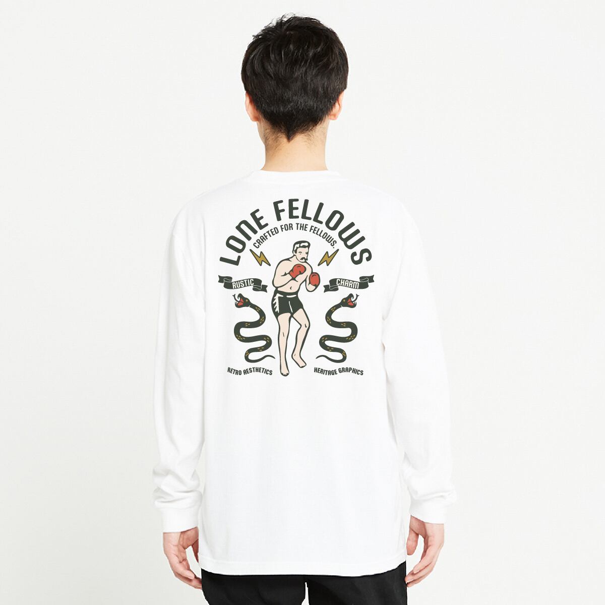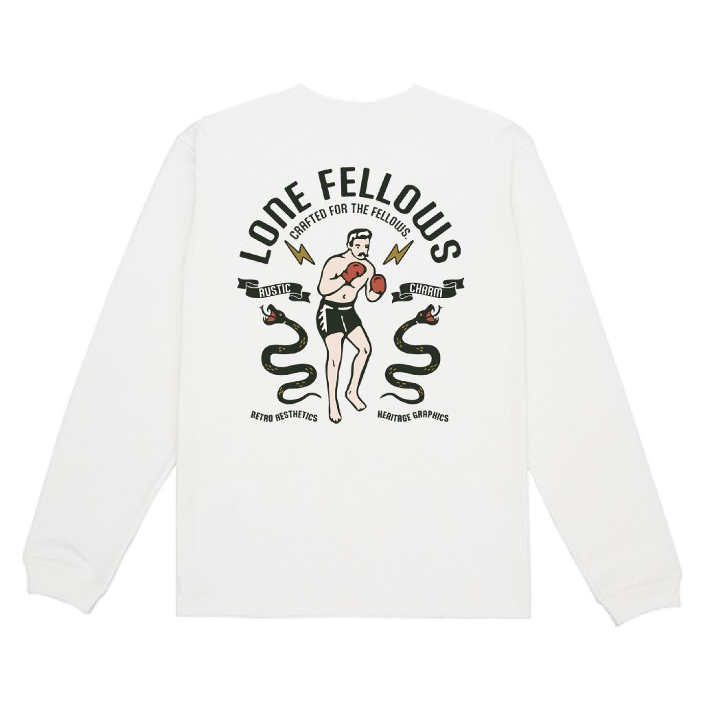 ヴィンテージのボクシングアートを現代に復元した「OLD SCHOOL BOXER」が、ロングスリーブモデルで登場。 フロントには誇り高きメインロゴ、バックには運命と闘い続けるボクサーの姿を。季節を問わず、自分自身の限界に挑み続ける「FELLOWS」へ贈る、エネルギッシュな一着です。