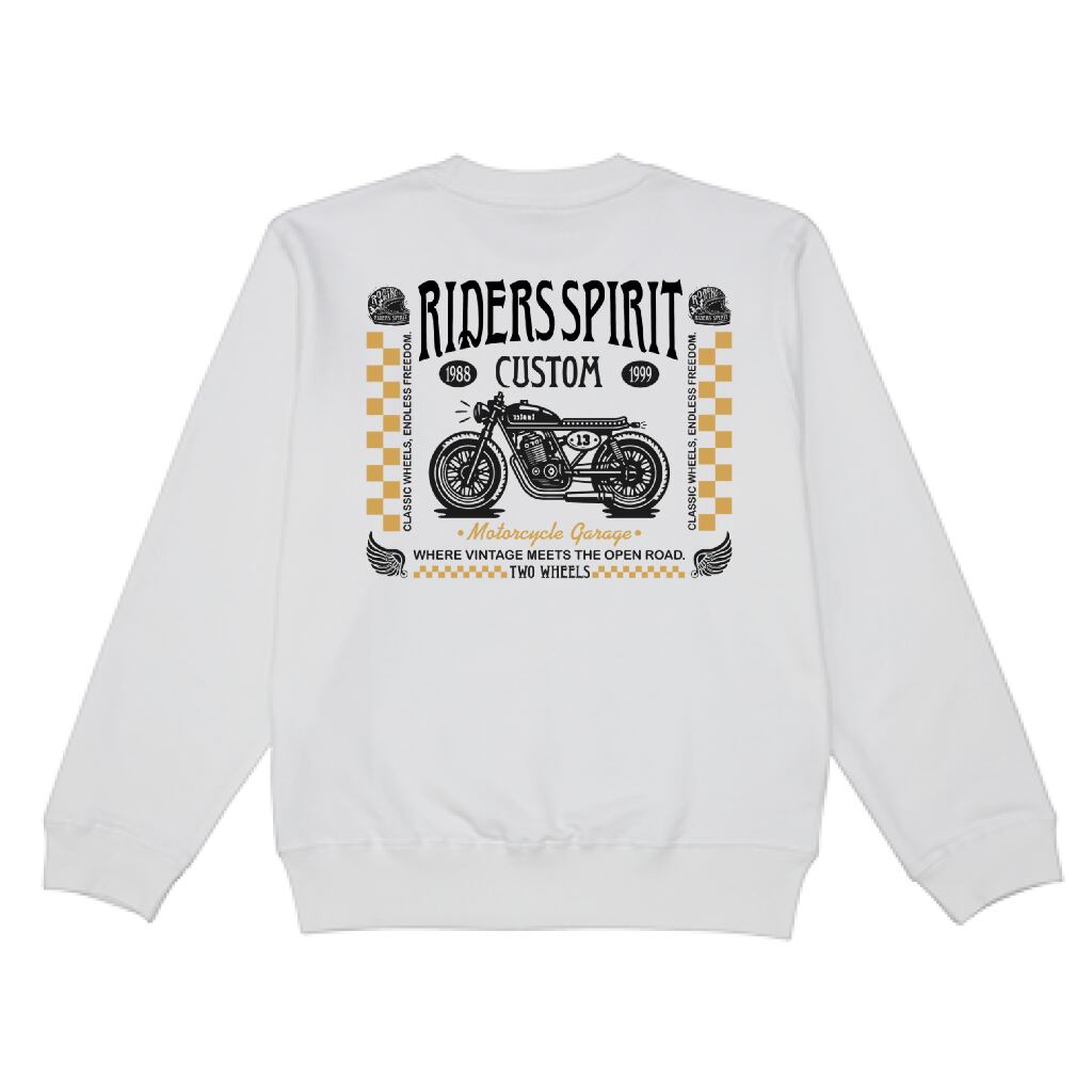 ヴィンテージ・カスタムバイクの魂を刻んだ「RIDERS SPIRIT」が、タフなヘビーウェイト・スウェットシャツで登場。 フロントにはブランドを象徴するメインロゴ、バックには緻密に描かれたモーターサイクルのグラフィックを。寒い季節のライディング・インナーとして、あるいはガレージでの休息を共にする一着として、FELLOWSの心に火を灯します。
